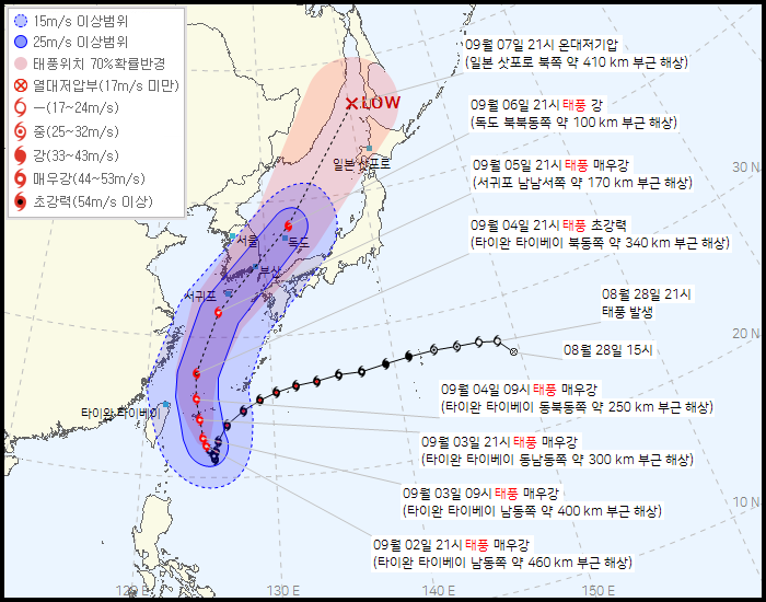 우리나라 기상청도 일본기상청과 매우 유사한 태풍 진로를 내놓고 있으며, 태풍의 강도는 제주도 남쪽 해역에 위치하는 9월 5일 밤에는 중심기압 945헥토파스칼, 최대풍속 초속 45미터의 매우 강한 태풍을 예상하고 있습니다. 태풍이 우리나라를 빠져나간 후인 6일 밤에도 중심기압 965 헥토파스칼, 최대풍속 초속 35미터의 강한 태풍으로 남아있을 전망입니다. 그만큼 우리나라를 통과하는 동안 큰 피해가 우려되는 상황입니다.