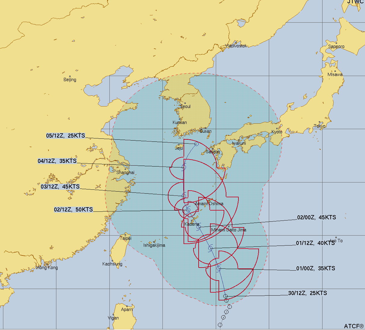 다행히도 대한해협에 근접할 시기인 7월 5일 밤의 중심풍속은 초속 12미터 수준으로 강풍에 의한 피해는 적을 것으로 보이나, 태풍이 머금고 올라오는 수증기를 쏟아내며 7월 5일과 6일 남부지방에 폭우가 내릴 가능성이 있습니다. 비 피해가 없도록 사전 대비가 필요합니다.