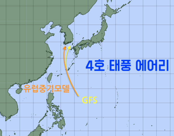 미국 해양대기청이 운용하는 GFS 예측모델은 미국합동태풍경보센터와 유사한 경로로 4호 태풍 에어리의 진로를 예상하고 있습니다. 한편 유럽기상청의 중기예측모델은 GFS모델과는 다소 차이가 나게, 4호 태풍 에어리가 전남 남해안에 상륙할 것으로 예상하고 있습니다.