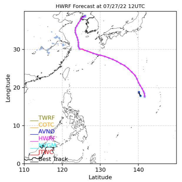 약화된 태풍 5호 송다가 서해를 지나 중국에 상륙할 것이라는 일본기상청의 예측과 약간 다르게, 미국 해양대기청 NOAA가 운영하는 HWRF 예측모델은 5호 태풍 송다가 태풍의 자격을 겨우겨우 유지하며 북한에 상륙할 것으로 예측하고 있습니다. 태풍 송다가 약한 태풍이므로 예측기관 간의 약간의 차이는 별다른 영향이 없을 것 같습니다.